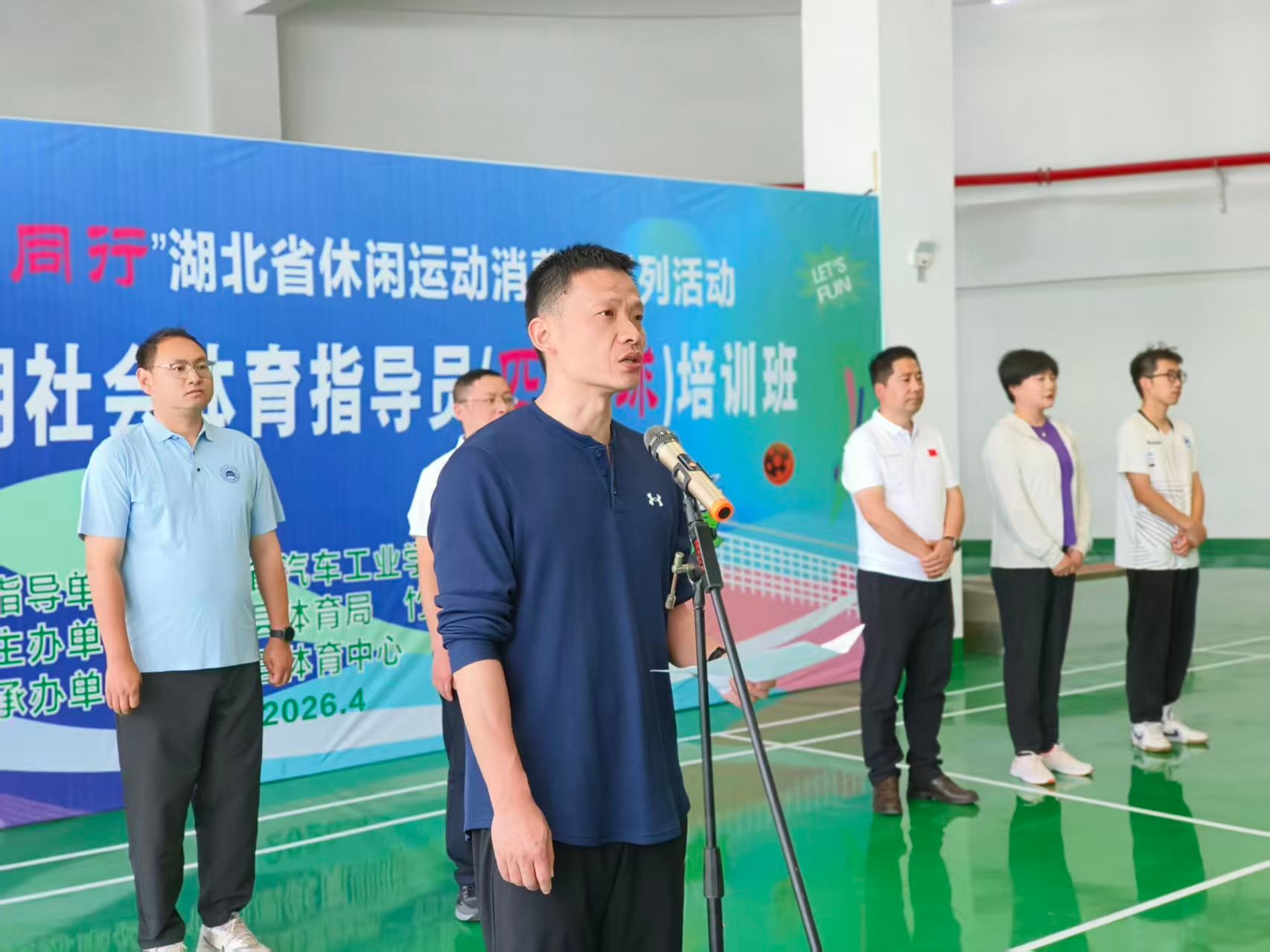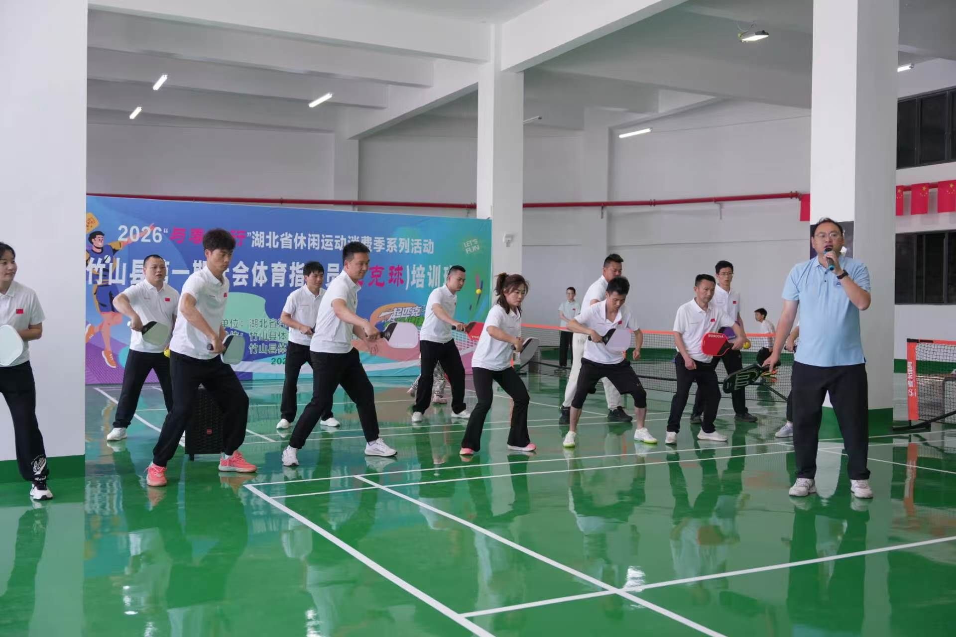 4月25、26日,2026年竹山县三级社会体育指导员匹克球项目培训班在县体育中心体育馆举行。来自全县各镇(区、街道)、各中小学的50余名基层体育骨干、十余名党政机关干部及社会体育爱好者参加了为期两天的专业培训。本次培训由竹山县教育体育局主办,湖北汽车工业学院体育学院为指导单位。